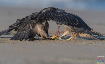 After a little while, the three young falcons started totally ignoring me and concentrated back on eating the fresh kill. This was my first ever sighting of juvenile Peregrine Falcons with food and as I mentioned, they were very recently fledged. In falcon families, the females are much larger in size than the males. Therefore, it was easy for me to distinguish the males from females. There were two females and one male on the beach that day. In the animal kingdom, the size difference naturally dictates the hierarchy in dominance-who gets to eat first. Obviously, the females were tearing apart the unfortunate bird, which I still could not figure out the ID of, and the male was patiently waiting for his turn. While in reality, it just took minutes for the hungry falcons to consume most part of the kill, to me it was happening in very slow motion.